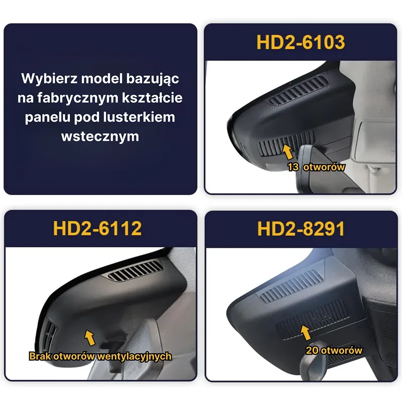 Poniżej znajdziesz opis modeli kamer FITCAMX (HD2-xxxxx) które mogą być kompatybilne z Twoim pojazdem. Kluczowym aspektem jest sprawdzenie kształtu fabrycznej obudowy pod lusterkiem wstecznym i na tej podstawie wybór wariantu kamery, który będzie dopasowany do obudowy w Twoim samochodzie.