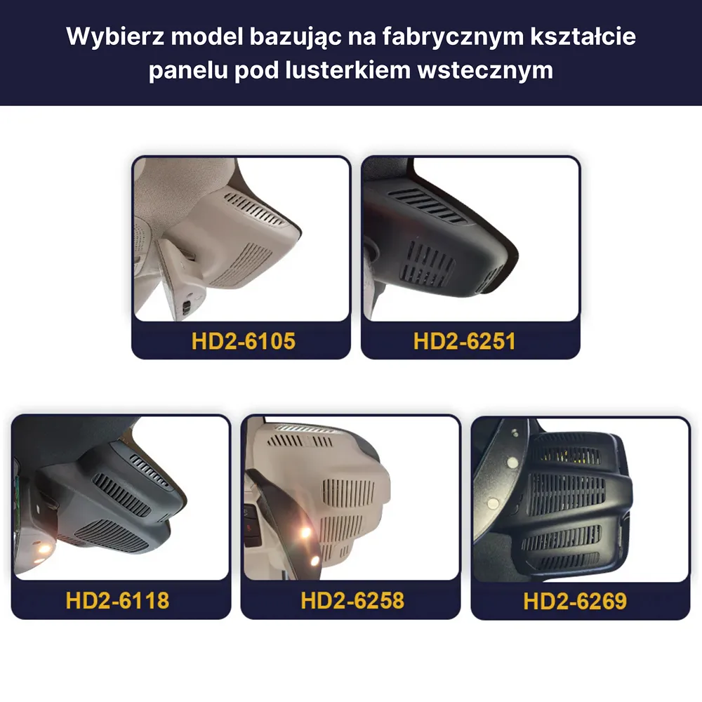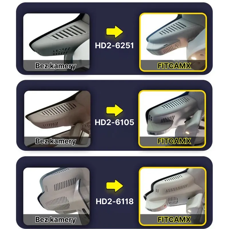 Poniżej znajdziesz opis modeli kamer FITCAMX (HD2-xxxxx) które mogą być kompatybilne z Twoim pojazdem. Kluczowym aspektem jest sprawdzenie kształtu fabrycznej obudowy pod lusterkiem wstecznym i na tej podstawie wybór wariantu kamery, który będzie dopasowany do obudowy w Twoim samochodzie.