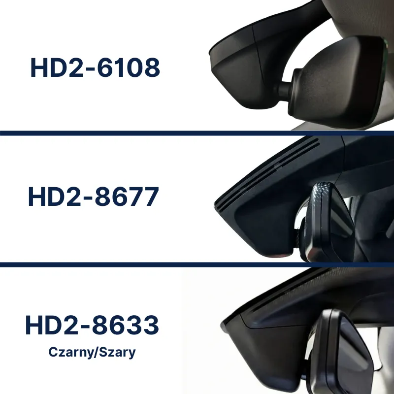 Poniżej znajdziesz opis modeli kamer FITCAMX (HD2-xxxxx) które mogą być kompatybilne z Twoim pojazdem. Kluczowym aspektem jest sprawdzenie kształtu fabrycznej obudowy pod lusterkiem wstecznym i na tej podstawie wybór wariantu kamery, który będzie dopasowany do obudowy w Twoim samochodzie.