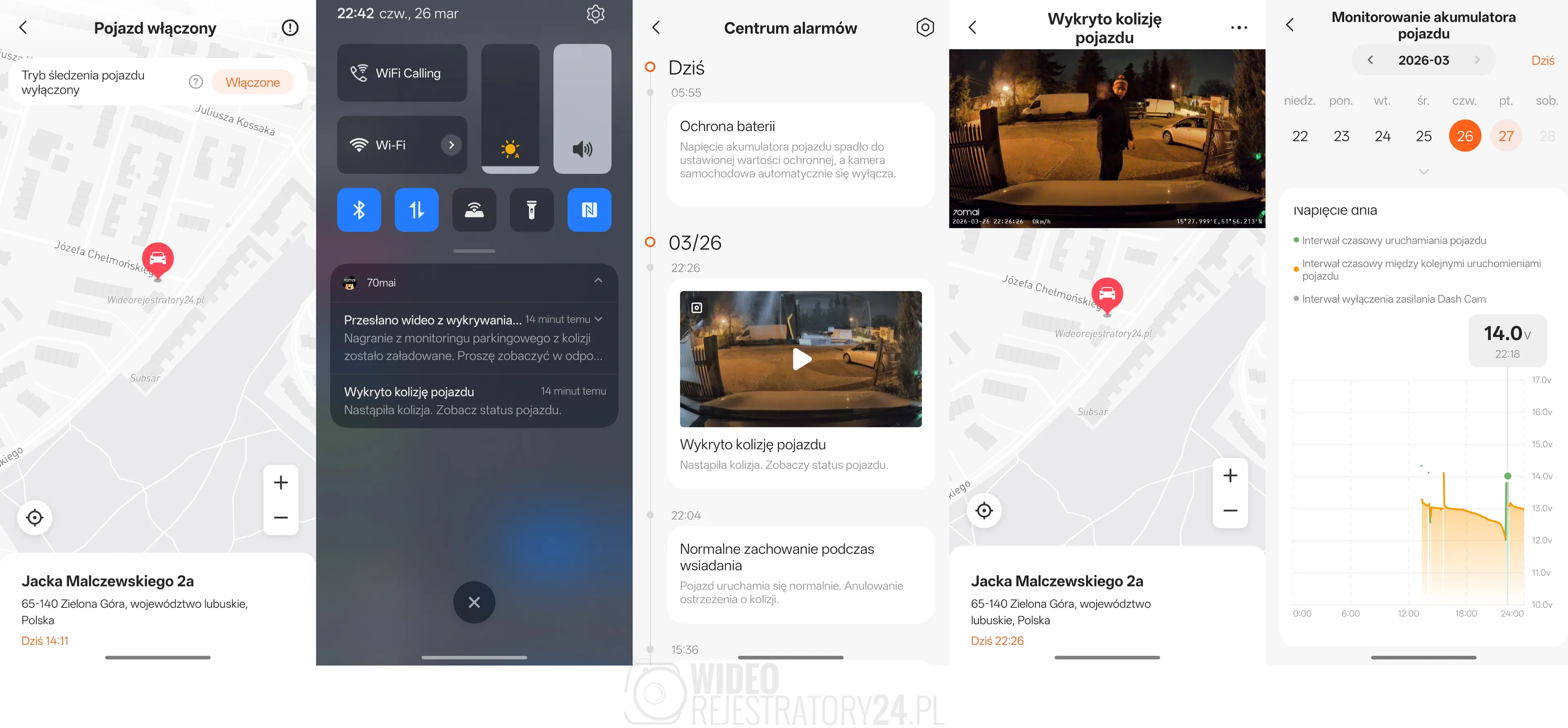 Zrzuty ekranu z aplikacji 70mai, prezentujące powiadomienia o zdarzeniach, podgląd zdalny, lokalizowanie pojazdu oraz weryfikację stanu naładowania akumulatora. Kliknij aby powiększyć