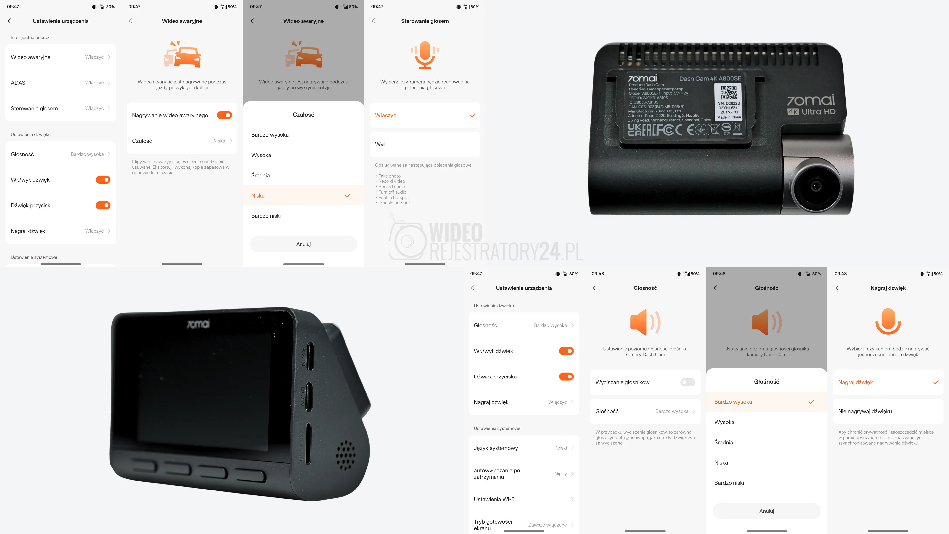 Model 70mai 4K A800SE reaguje na następujące polecenia: