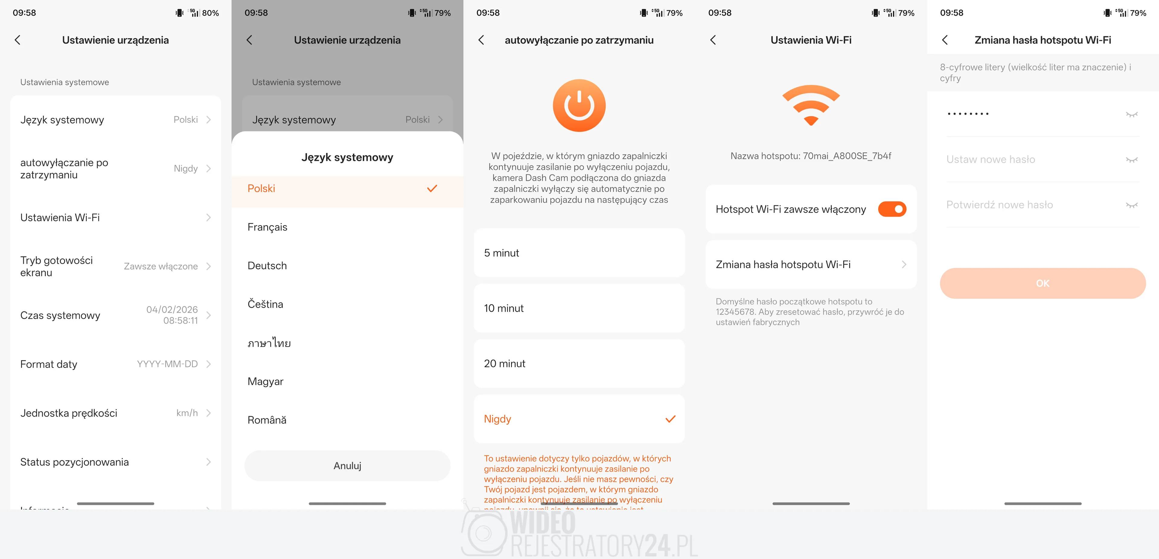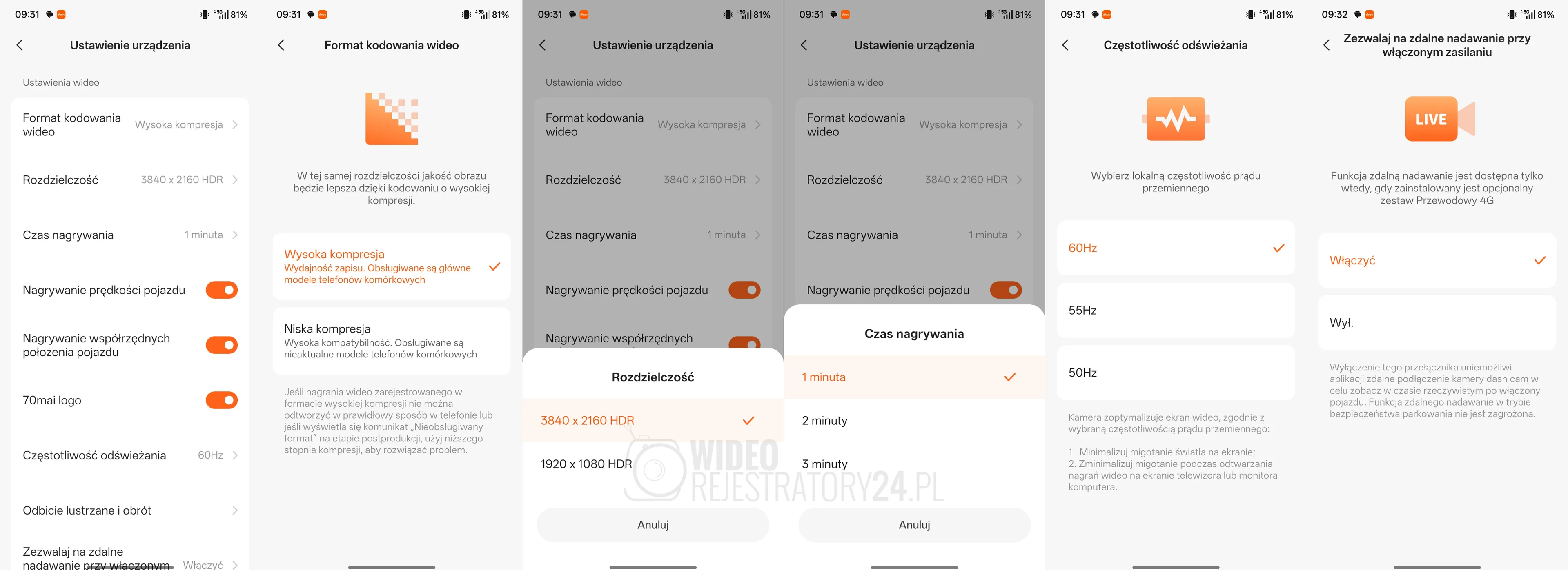 Zrzuty ekranu z aplikacji mobilnej 70mai prezentujące dostępne funkcje. Kliknij aby powiększyć