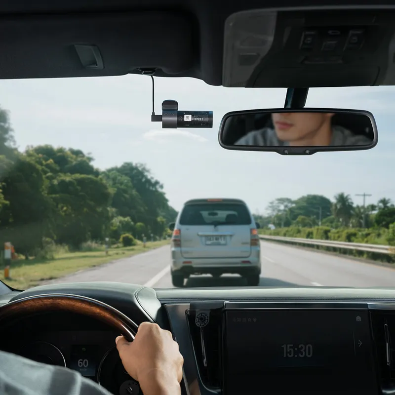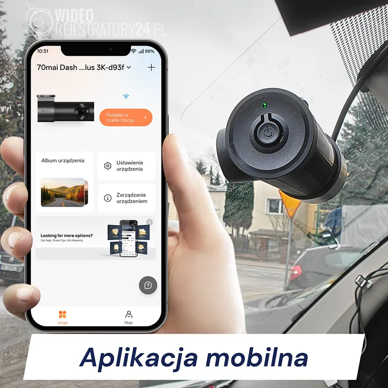 Brak wyświetlacza w kamerze to większa widoczność przez przednią szybę, a aplikacja mobilna sprawia, że zarządzanie nagraniami 3K jest znacznie wygodniejsze i szybsze niż na małym ekranie tradycyjnego wideorejestratora.
